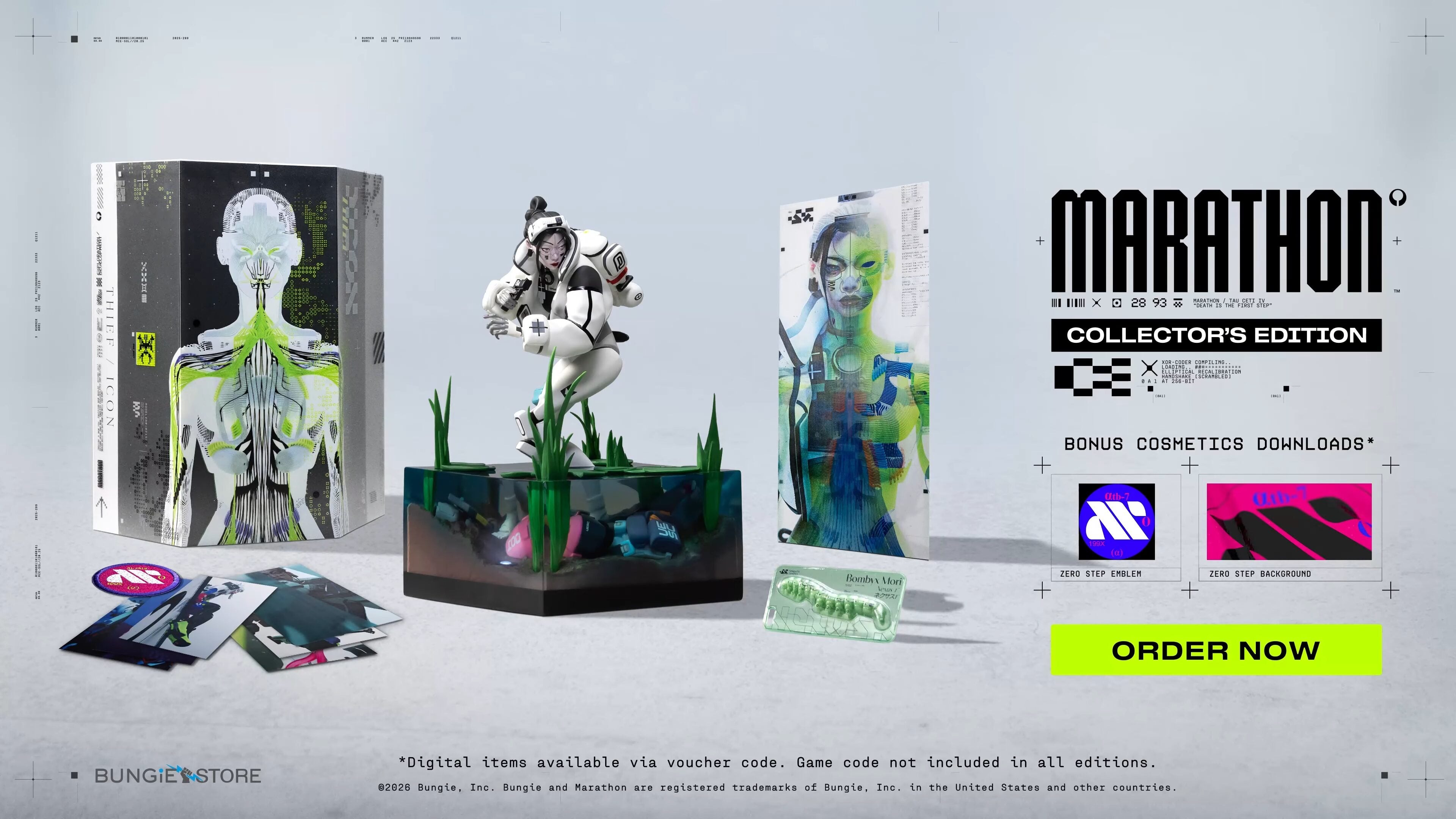 Bungie также представила коллекционное издание Marathon, распаковка которого была вдохновлена процессом плетения оболочек бегунов корпорацией Sekiguchi Genetics. После распаковки перед игроками предстанет фигурка Вора в масштабе 1/6 с LED-подсветкой, коллекционная миниатюра червя-ткача, шесть открыток, постер, нашивку и цифровые награды. Данное издание не включает в себя саму игру.